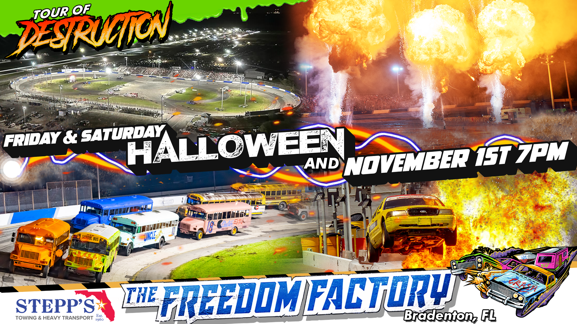 SCHOOL BUS FIGURE 8 RACING, PUMPKIN SMASH RACE, TRAILER RACE, LIGHTS OUT RACE, CAR CRASHING STUNTS, FIREWORKS